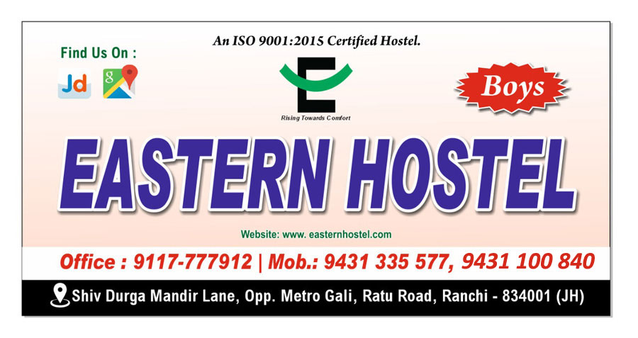 Eastern Hostel is an ISO 9001:2015 Certified Hostel. Established in the year 2007, is a top player in the category Hostels in the Ranchi. Motive of providing comfortable Lodging to working men and academic students. It is the Best Boys Hostel in Ranchi. This well-known establishment acts as a one-stop destination servicing customers both local and from other parts of Ranchi. Some of the facilities provided are - 3-times Mess (Veg. & Non-Veg.), Emergency Light 24x7, 24x7 Water Supply, Aquaguard Drinking Water, 24x7 Security Guard & CCTV.
